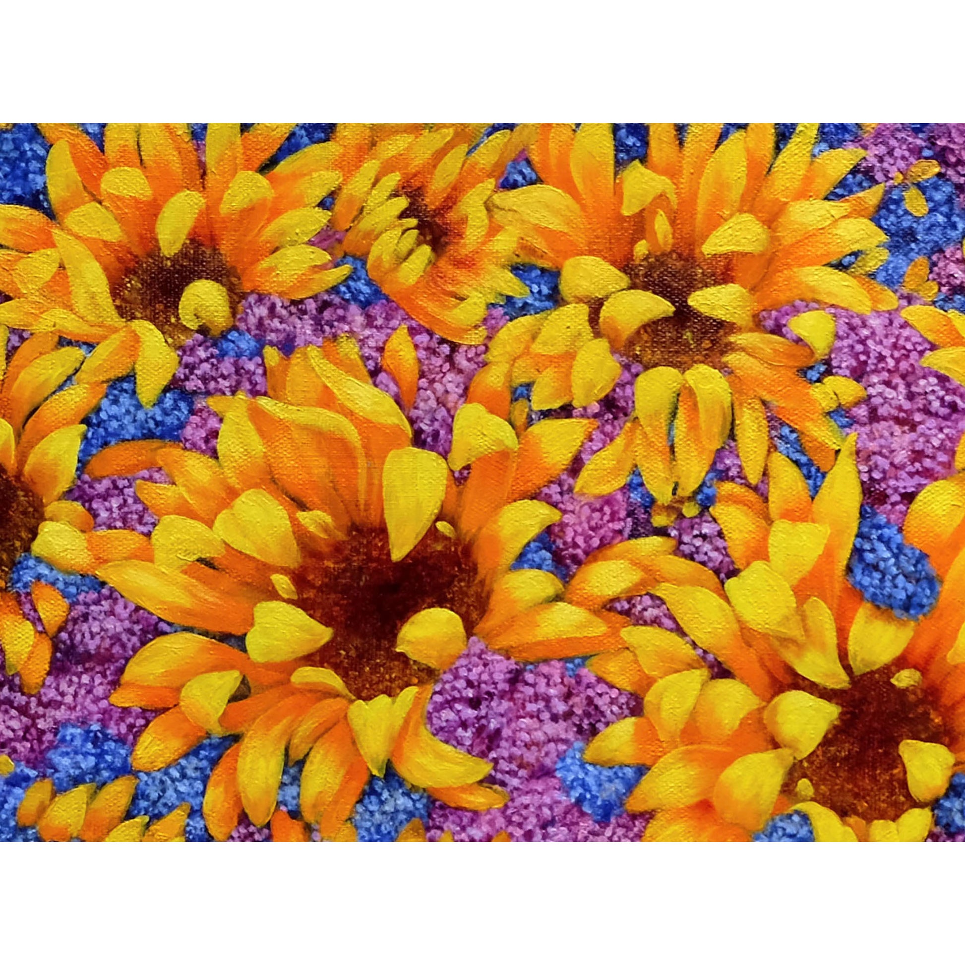 “Girasoles con Lilas” es un óleo original de la artista Anastasia Woron, una obra de estilo impresionista donde los tonos cálidos de los girasoles se mezclan con matices violetas y azules, creando una explosión de color y vida. Perfecto para quienes buscan arte vibrante y auténtico para su hogar o colección privada.