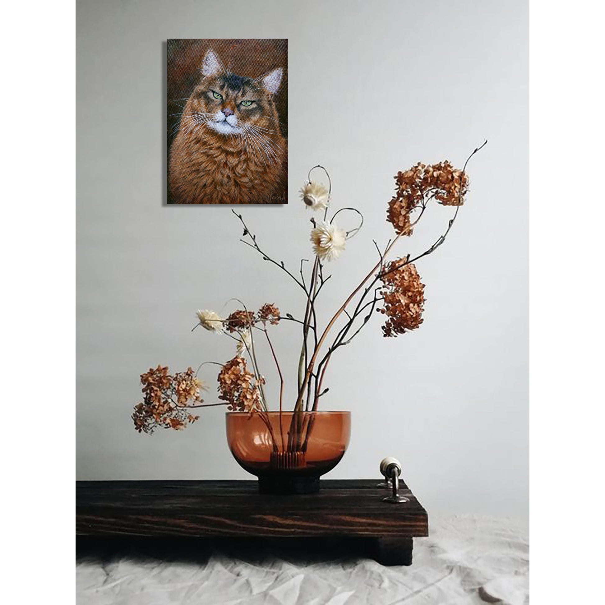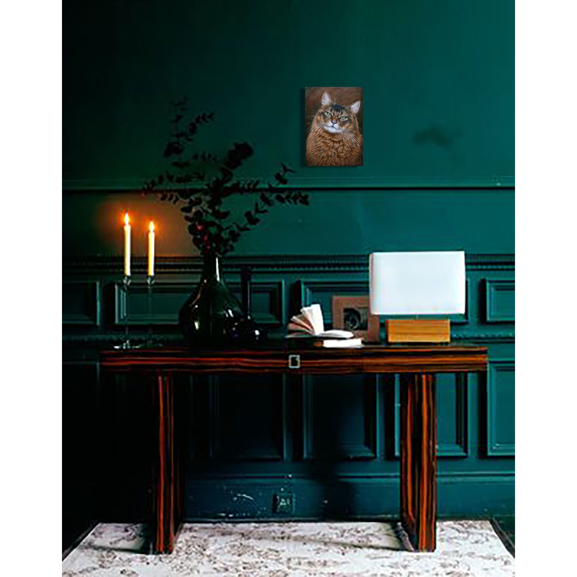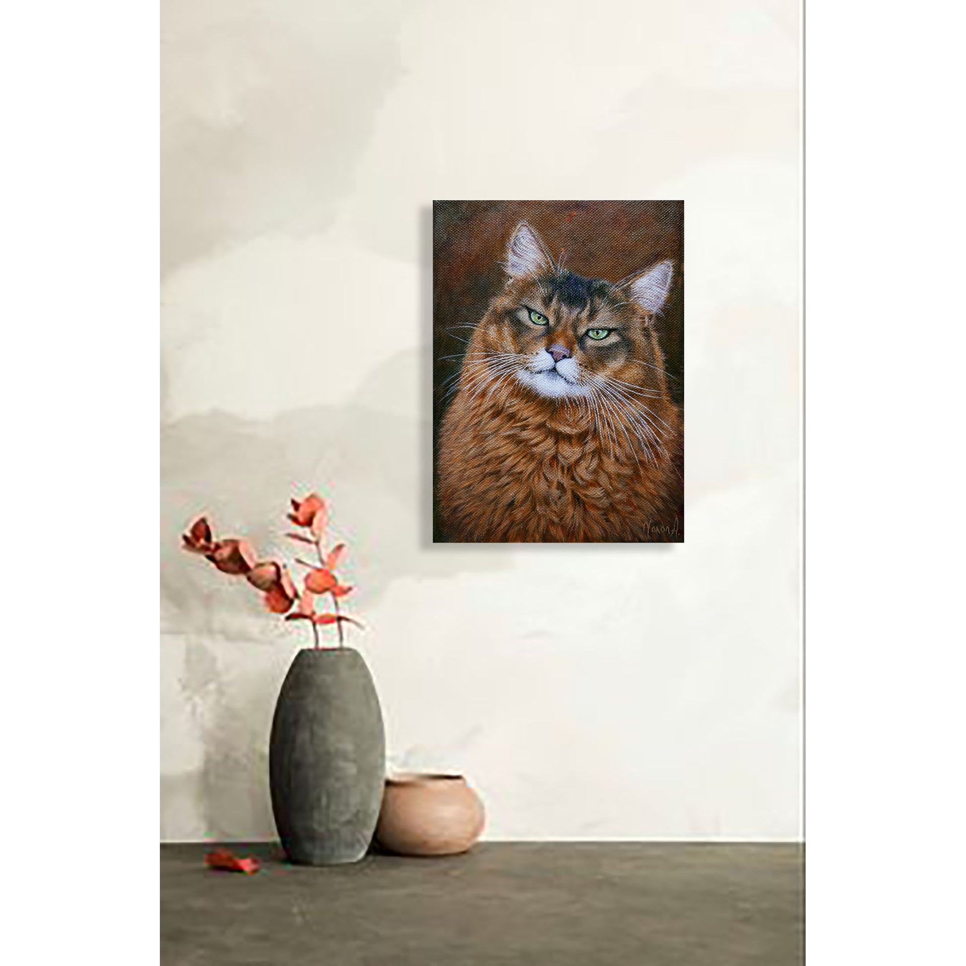 “Mirada Verde” es una obra al óleo que captura la intensidad tranquila de un gato de pelaje cobrizo. El realismo preciso y la luz contenida concentran la atención en unos ojos verdes profundos que sostienen la mirada y generan una conexión emocional directa con el espectador. Una pieza íntima, contemporánea y muy expresiva, ideal para espacios pequeños o como obra-regalo para coleccionistas.