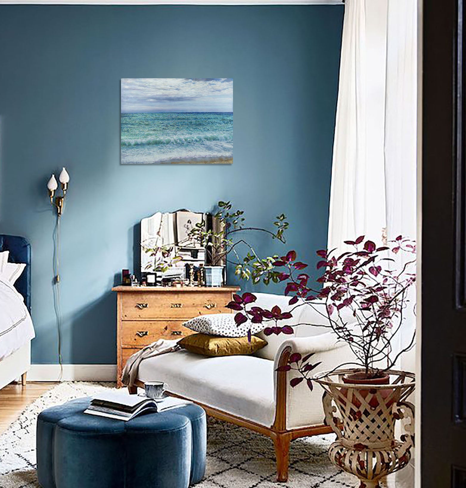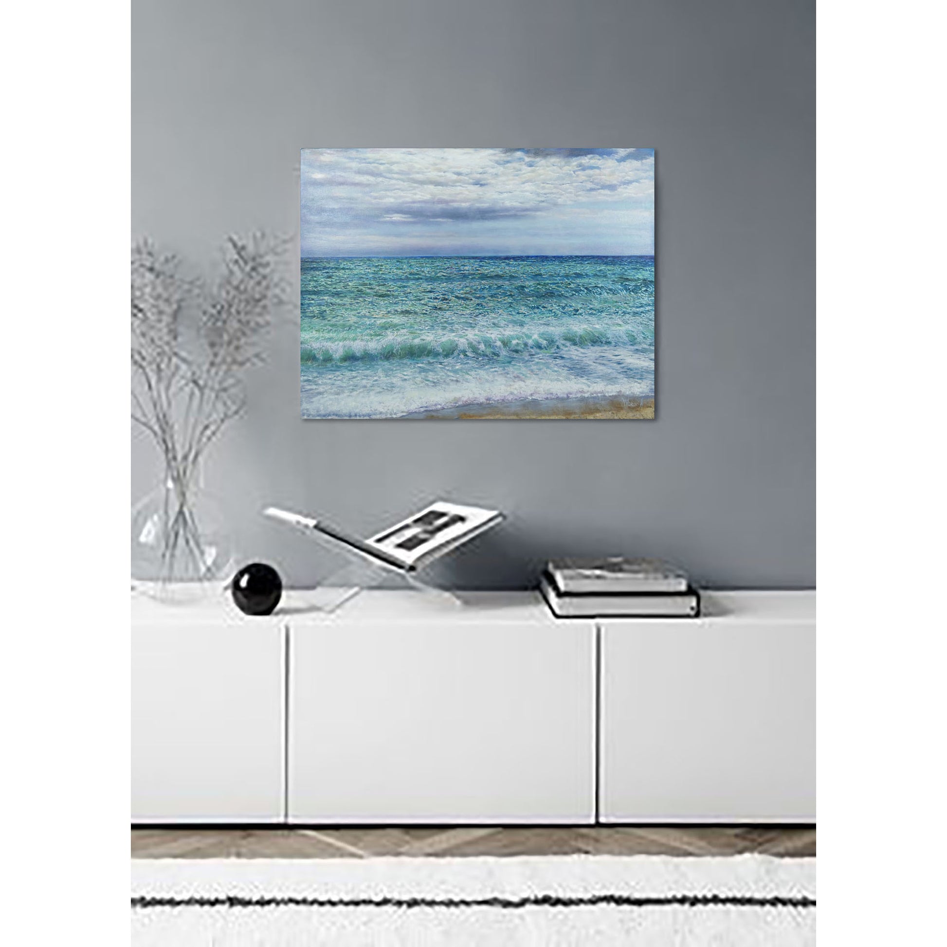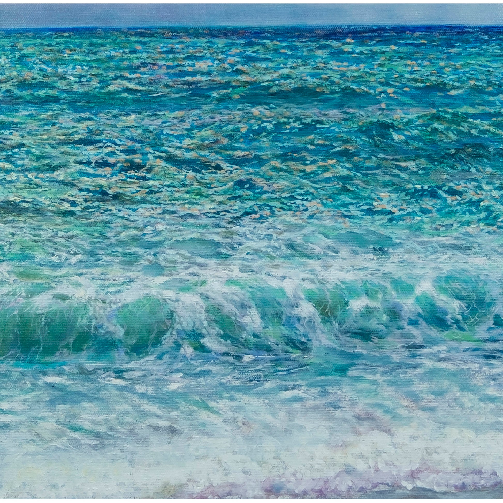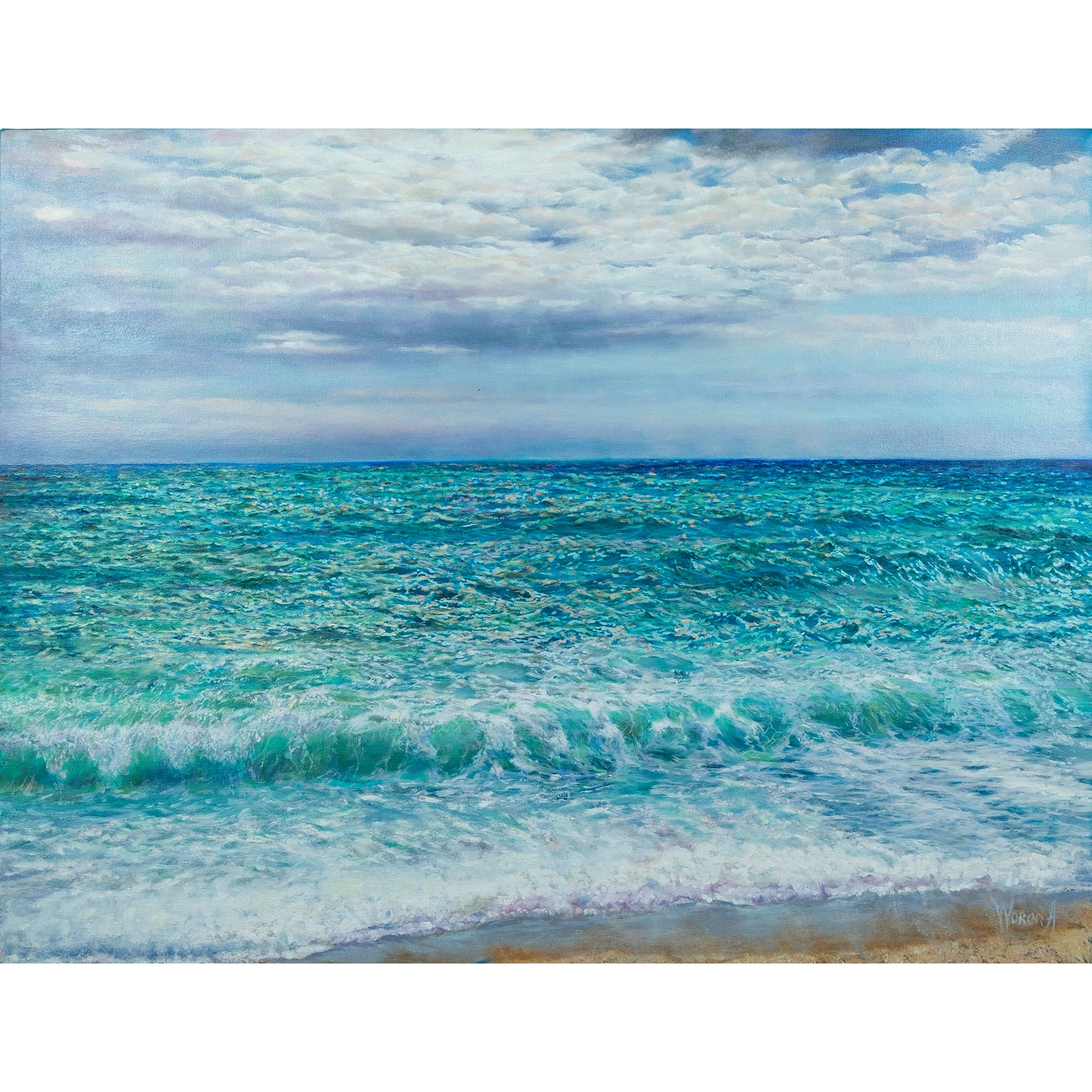 En esta obra, Anastasia Woron investiga la vibración de la luz sobre el agua y la relación entre color, materia y percepción. Con una composición horizontal estable y una pincelada estructurada, construye un mar en constante movimiento, donde el horizonte ordena la mirada y la atmósfera amplía el espacio, reforzando la identidad de su lenguaje visual contemporáneo.