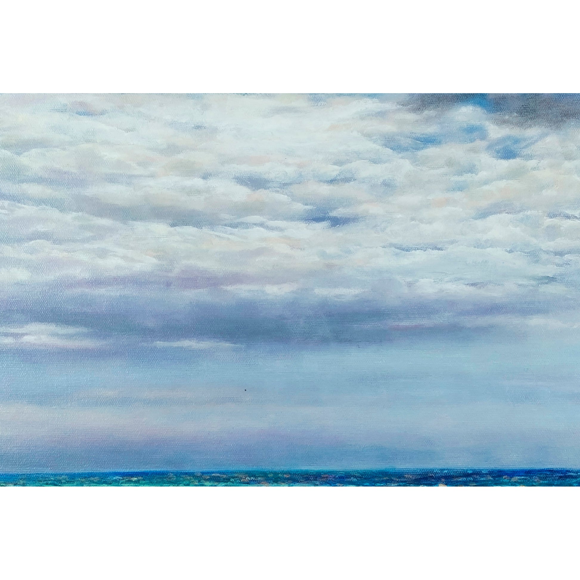 Esta obra investiga la percepción del paisaje costero a través de luz y color, consolidando la exploración de Anastasia Woron sobre horizonte, atmósfera y ritmo pictórico.