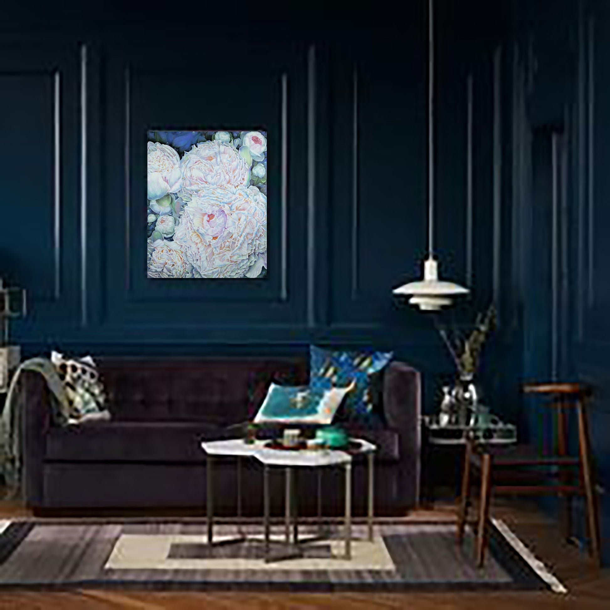 Obra centrada en la belleza serena de las peonías blancas y en el equilibrio entre luz, volumen y suavidad cromática.